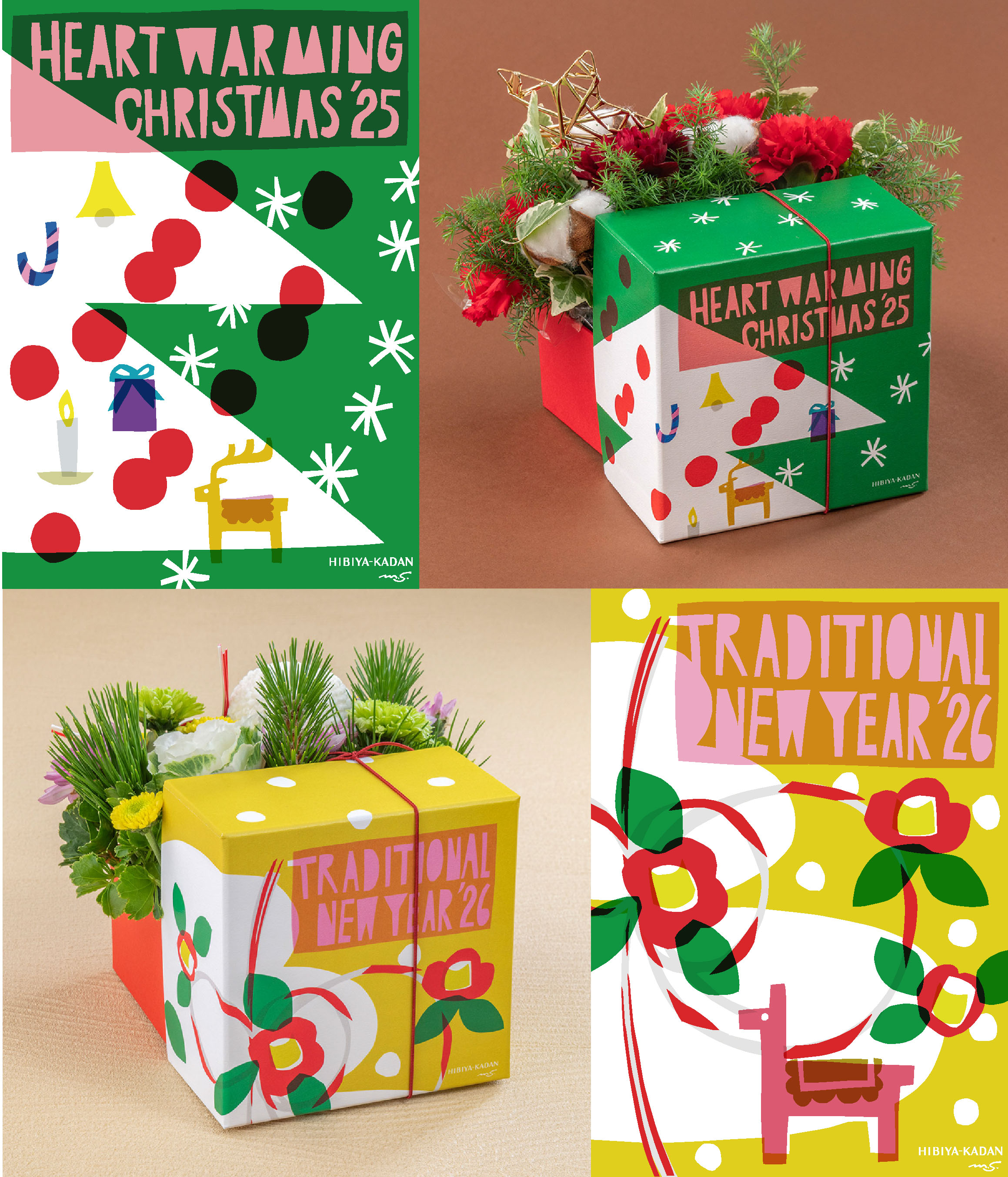 日比谷花壇の2025-26ホリデーシーズン用のビジュアルデザインを手掛けました。一気に華やかになる時期の街中にあっても埋もれることのない、力強く可愛いビジュアルを意識しています。