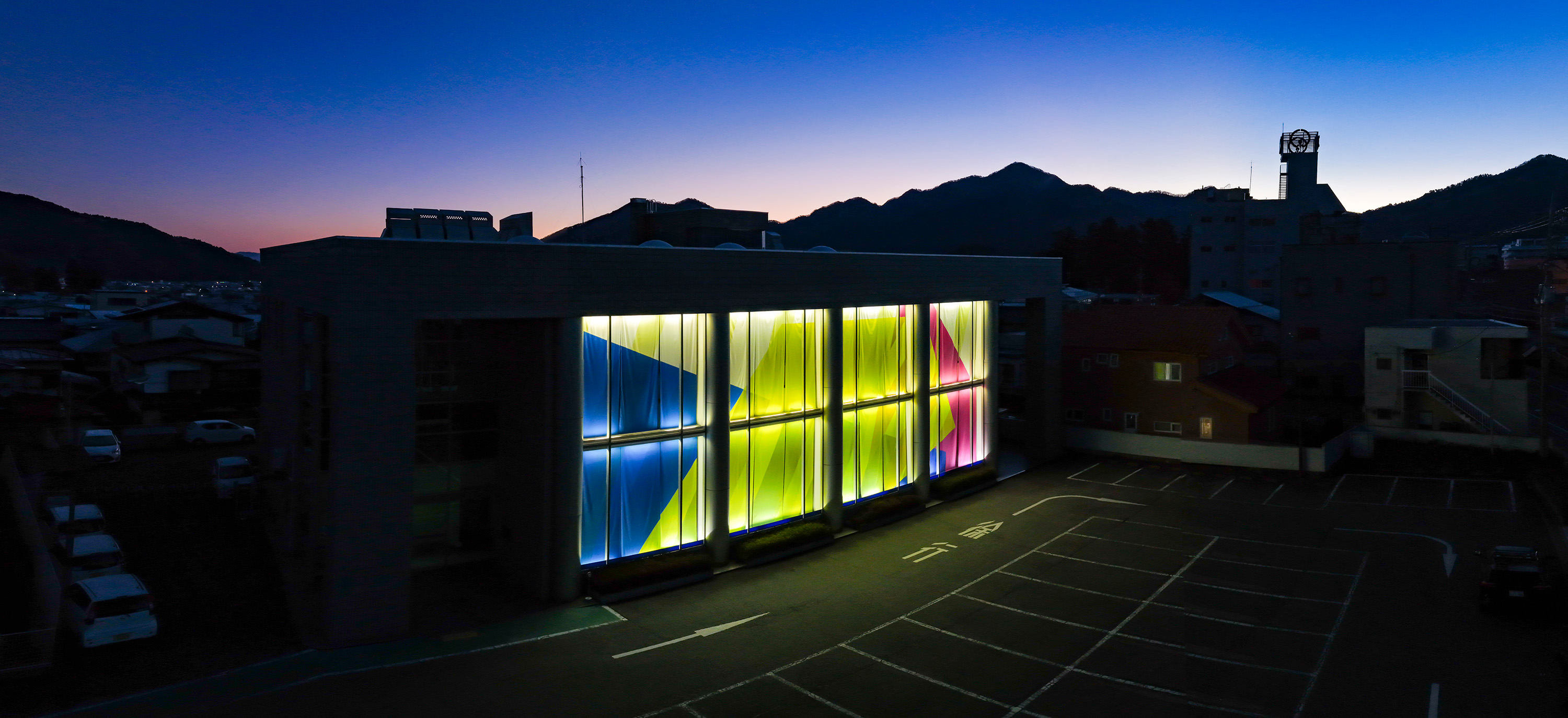 山梨中央銀行吉田支店の正面ファザードと店内を生地で装飾。店内側は銀行の営業時間のみですが、外側は夜22:00までライトアップされています。